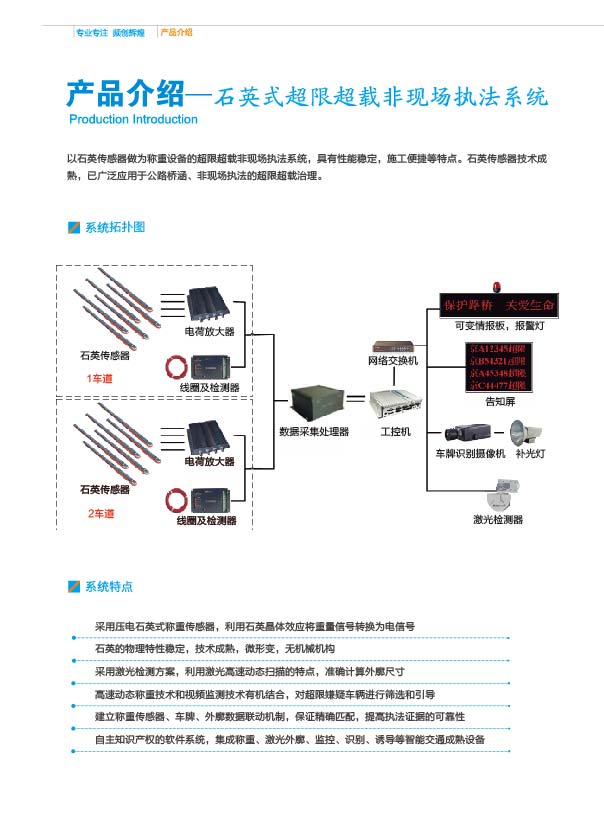 我們通過在智能交通領域的不斷探索、實踐和技術積淀,結合公路管理部門針對道路、橋涵超限超載治理的具體需求,開發出基于高速動態稱重技術、激光檢測技術和視頻監測技術相結合的超限超載非現場執法系統。